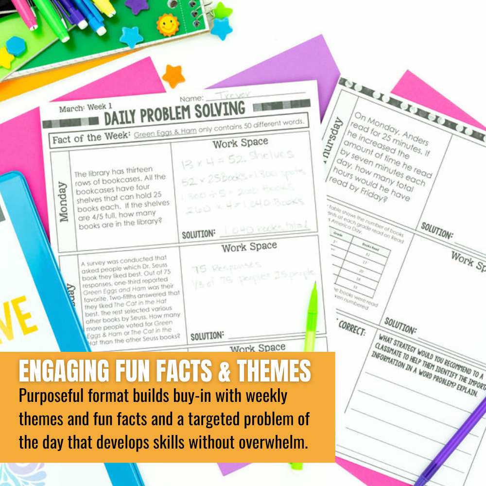 With nearly 300 word problems spanning all 12 months, each week centers on a kid-friendly theme and begins with a fun fact to spark curiosity. Students solve one multi-step problem per day, while teachers get built-in opportunities for review, discussion, and informal assessment.