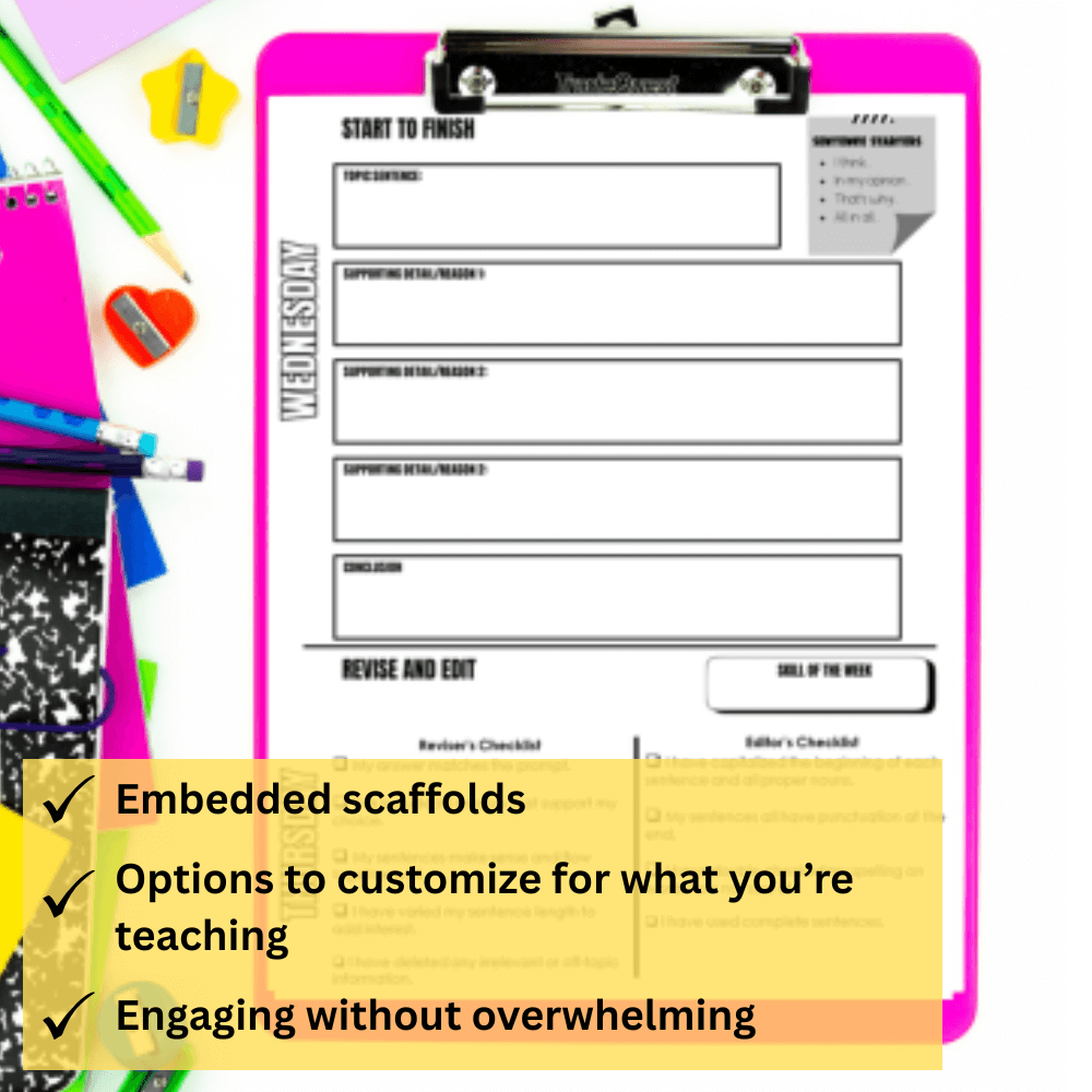 - 5-day weekly structure: brainstorm → supporting details → topic + closing sentence → revise/edit → publish