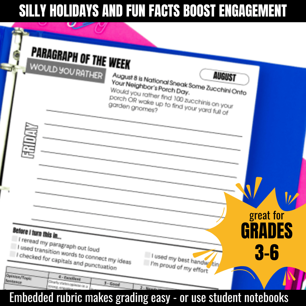 Designed as a paragraph of the week routine, each week features a “this or that” style prompt based on a fun August holiday that sparks discussion and builds writing confidence. Students brainstorm, write topic and detail sentences, revise, and publish—all in just a few minutes per day.